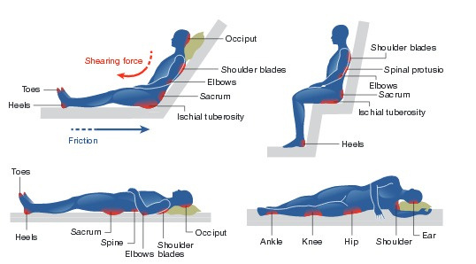 The red areas in the illustration below show common areas where pressure sores can develop. Please discuss these with your care team to learn about pressure relief techniques for these areas.